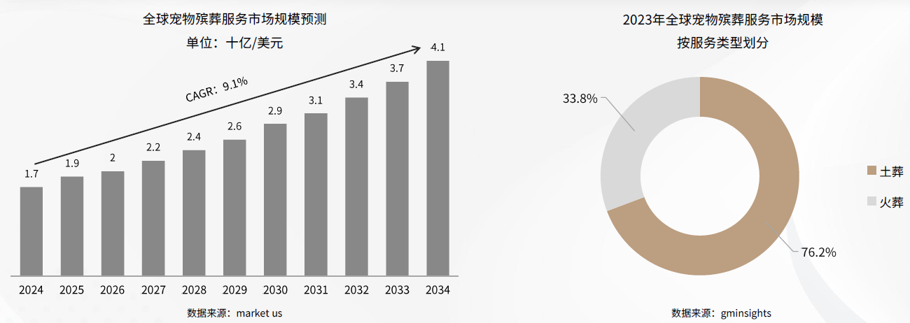 转型背后是全球宠物殡葬市场的爆发:数据显示,全球宠物殡葬服务市场规模预计在2030年达到37.5亿美元,年复合增长率超过11%,增速比人类殡葬市场还高。