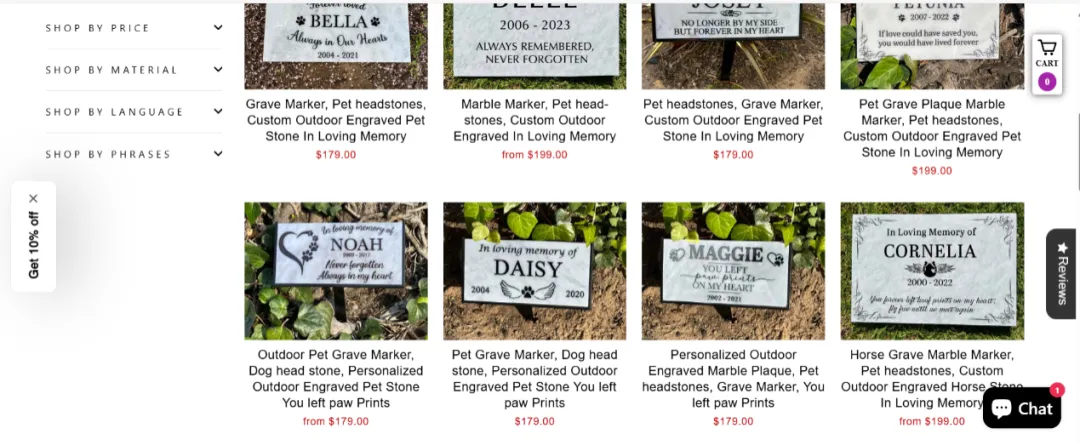 据媒体报道,美国独立站My Furever Memories通过提供定制化的宠物墓碑和骨灰雕塑服务,年收入达到了500万美元。虽然其单块宠物墓碑售价在68美元到290美元不等,但仍有不少用户愿意为之买单。