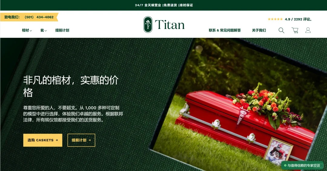 美国品牌Titan Casket通过成立独立站绕过殡仪馆垄断,将棺材售价降至殡仪馆的1/3(均价1000美元左右),凭借超过1000个SKU的个性化定制和人性化服务,成功撬动被传统巨头把持的市场。2024年12月,其独立站在线月销售额突破90万美元。