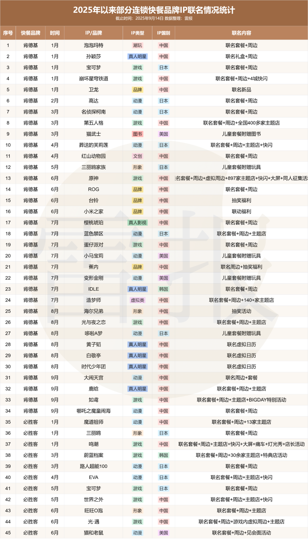 雷报近期已在《暑期档57起联名,34亿营销费,新茶饮们还“卷”得动吗?》和《年内IP联名28+起,罗森等便利店正成为年轻人的“情绪消费”新阵地?》两篇文章中分析了新茶饮和便利店品牌的IP联名营销情况。本文则将聚焦IP联名的另一大重镇——连锁快餐品牌。经人工统计(存在一定误差),年内9大主要快餐品牌已推出近百场IP联名活动,本文将以这些案例及相关财报数据为依据,分析快餐行业IP联名的最新情况。