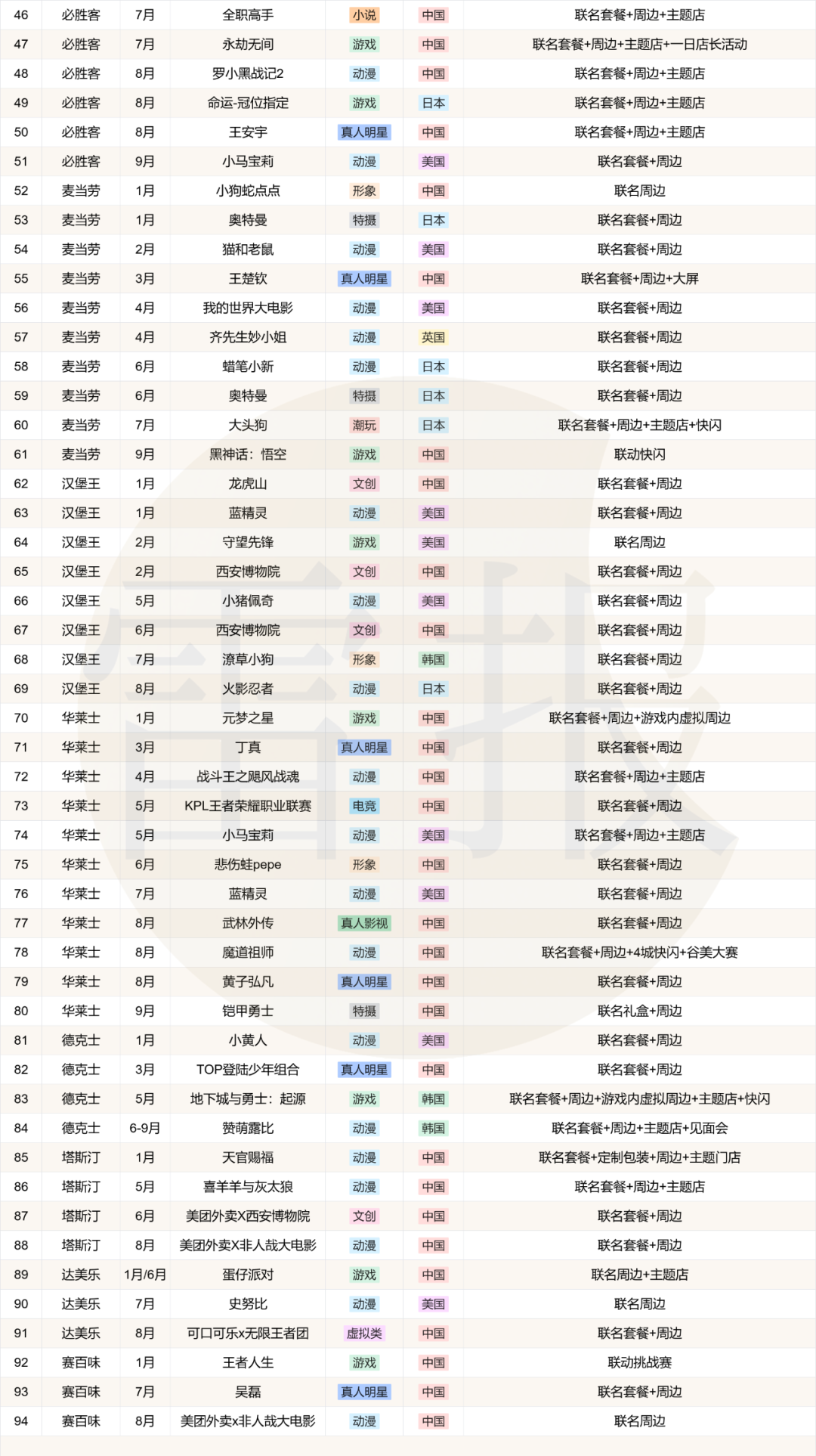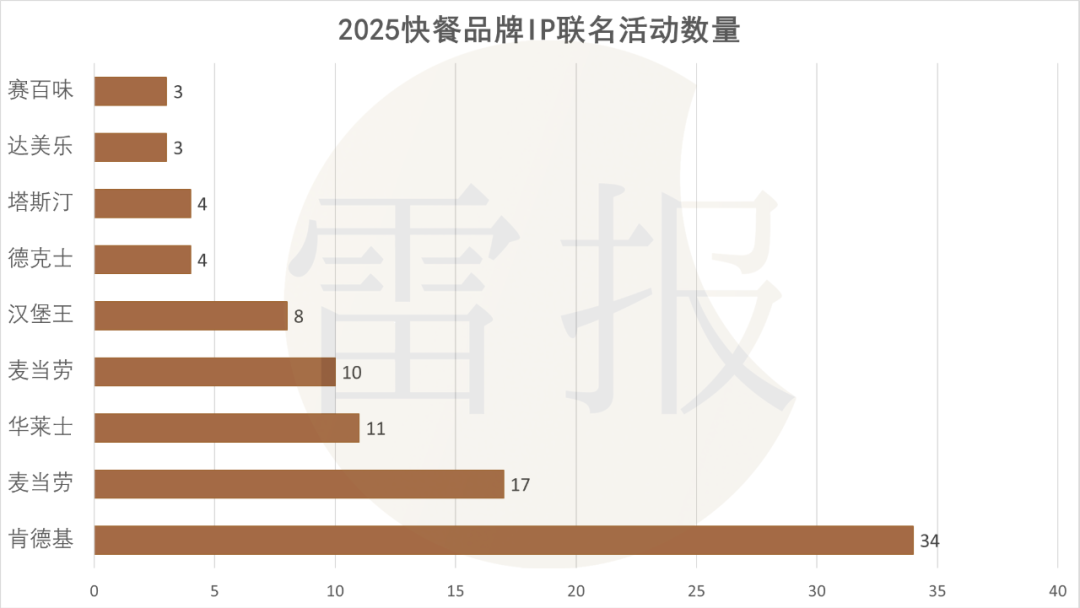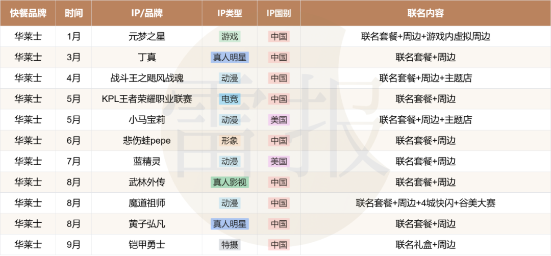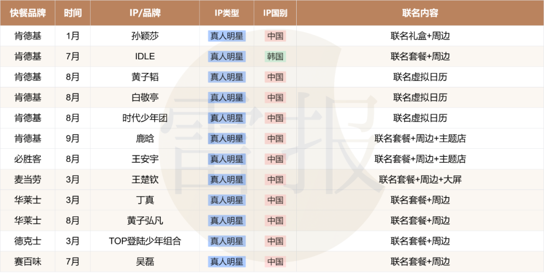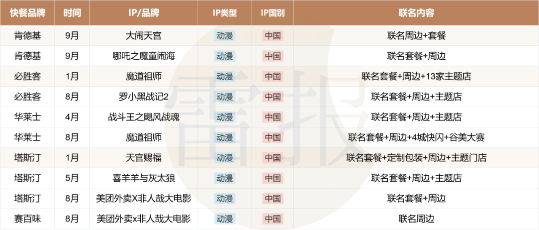 具体来看,以今年以来的9大快餐品牌(肯德基、必胜客、华莱士、麦当劳、塔斯汀、汉堡王、德克士、达美乐、赛百味)的联名活动作为样本(人工统计存在误差),可以发现: