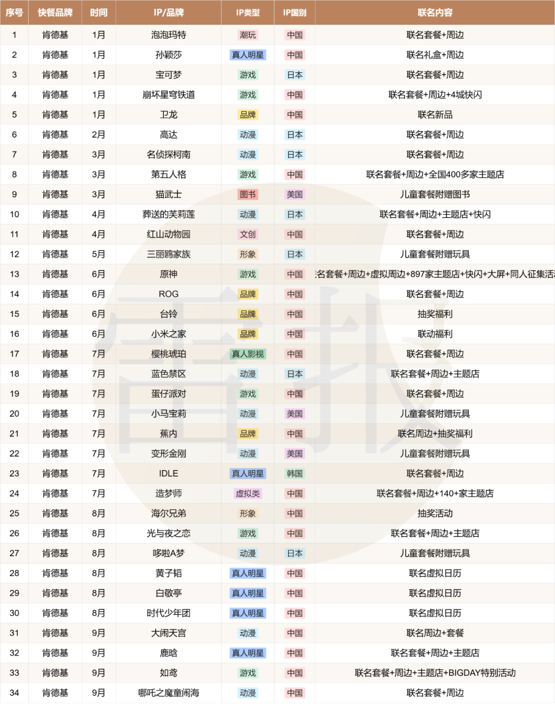 统计发现,动漫(33次)、游戏(20次)、真人明星(12次)是最受快餐品牌青睐的联名IP类型,三大类合计占到总联名次数的七成左右。同时,在这个“万物皆可IP”的时代,形象、文创、特摄、潮玩、虚拟等其他类型的IP或者品牌也都加入到联名大军中,以期实现所谓的强强联合和双向赋能。