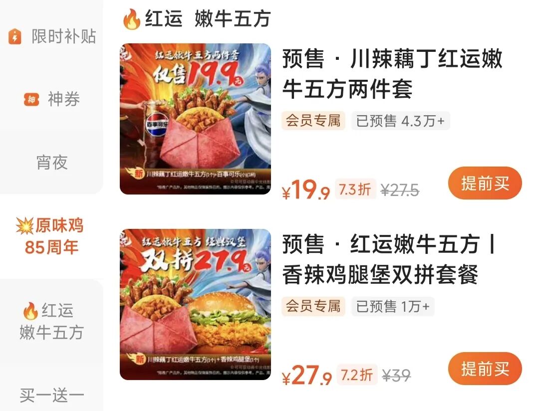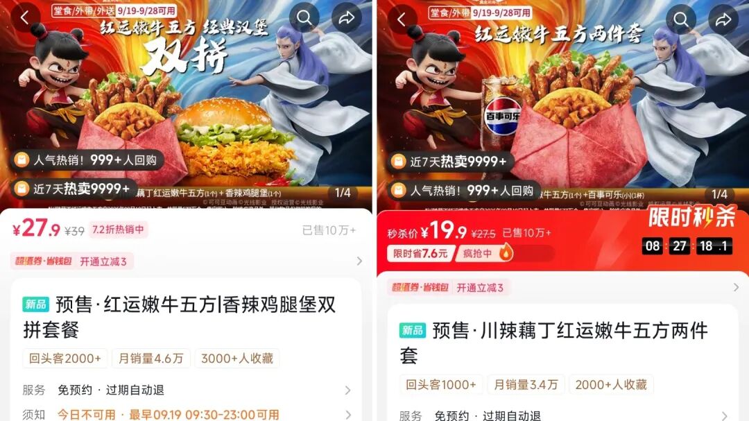 例如今年1月,肯德基与乒乓球运动孙颖莎的联名套餐(单价69元)在每单限量1份的情况下,开售2个半小时的实时销量便达到了50万桶,总销售额超3450万元;9月1日才官宣的《大闹天宫》联名玩具,如今抖音上的话题播放量已高达1.7亿次;今日下午官宣的《哪吒之魔童闹海》联名,短短几个小时,在抖音及美团双平台的预售总额便接近600万元。