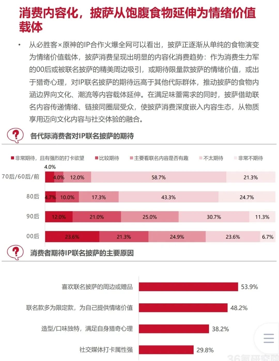 必胜客今日在与36氪研究院“联合”发布的《2025年中国披萨行业研究及消费趋势报告》中便特别提及了一个重大趋势,那就是披萨正从饱腹食物延伸为情绪价值的载体,在满足味蕾需求之外,借助联名其还能够传递情绪、链接同圈层受众。报告统计的数据也显示,90后和00后对IP联名披萨存在较高期待值的群体占比分别高达33%及44.9%,而对于IP联名期待的前两大因素都在于联名周边或赠品所提供的情绪价值。