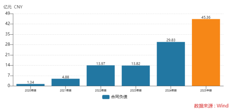 截至2025年上半年末公司合同负债45.36亿元,较上年末增加了15.53亿元,增幅超50%,2023年末这一数值只有13.82亿元。