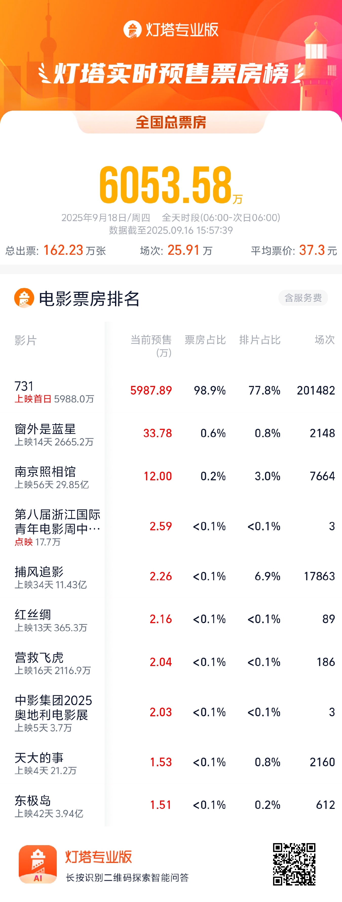9月16日,据灯塔专业版实时数据,影片《731》将于9月18日上映,当前影片首日排映场次已突破20万场,场次占比77.8%。