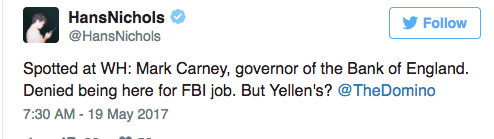 5月19日,NBC记者汉斯·尼科尔斯(Hans Nichols)发推称:“在白宫看到:英国央行的行长马克·卡尼。否认来竞聘FBI局长。不过或许是为了耶伦的工作而来?”