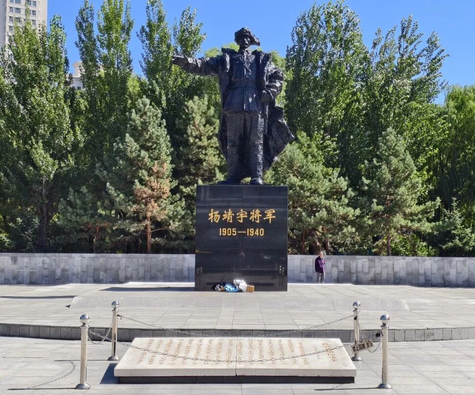 该雕像位于公园西南角靖宇广场内,2004年8月15日落成,高5.2米,雕像前下方用汉白玉篆刻杨靖宇将军的生平简历。杨靖宇,1905年生于河南省确山县一个农民家庭。学生时代积极投身反帝爱国运动。1927年加入中国共产党,1931年九一八事变后,他任东北反日总会会长兼中共道外区委书记。1932年5月,任中共哈尔滨市委书记,兼任中共满洲省委候补委员,代理中共满洲省委军委书记。后来,杨靖宇以省委代表身份被派往南满,组建中国工农红军第三十二军南满游击队和第三十七军海龙游击队,任政治委员,创建了以磐石红石砬子为中心的抗日游击根据地。1933年9月,成立东北人民革命军第一军独立师,杨靖宇担任师长兼政委。1934年2月,东北人民革命军第一军独立师联合南满16个抗日武装部队,成立东北抗日联合军总指挥部,杨靖宇当选总指挥。同年11月,正式建立东北人民革命军第一军,杨靖宇任军长兼政委。1935年8月,成立东北抗日联军第一军,杨靖宇任军长兼政委。1936年6月,东北抗日联军第一、第二军合编为东北抗日联军第一路军,杨靖宇任总司令兼政委。1937年,杨靖宇任东北抗日联军第一路军总指挥兼政委。
