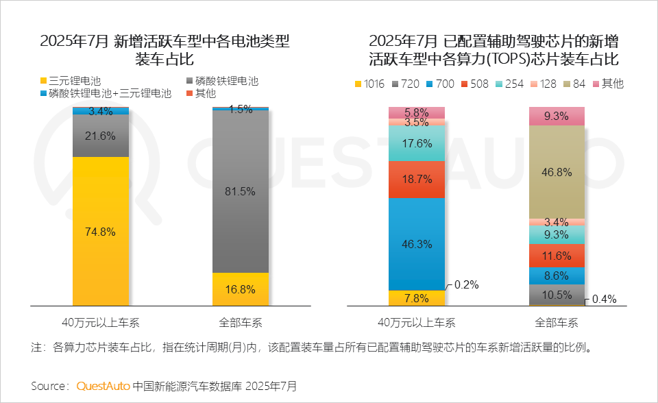 4、40万元以上车系普遍搭载能量密度更高的三元锂电池,超过70%的车型配备算力达508 TOPS以上的辅助驾驶芯片,以满足高阶辅助驾驶功能的需求