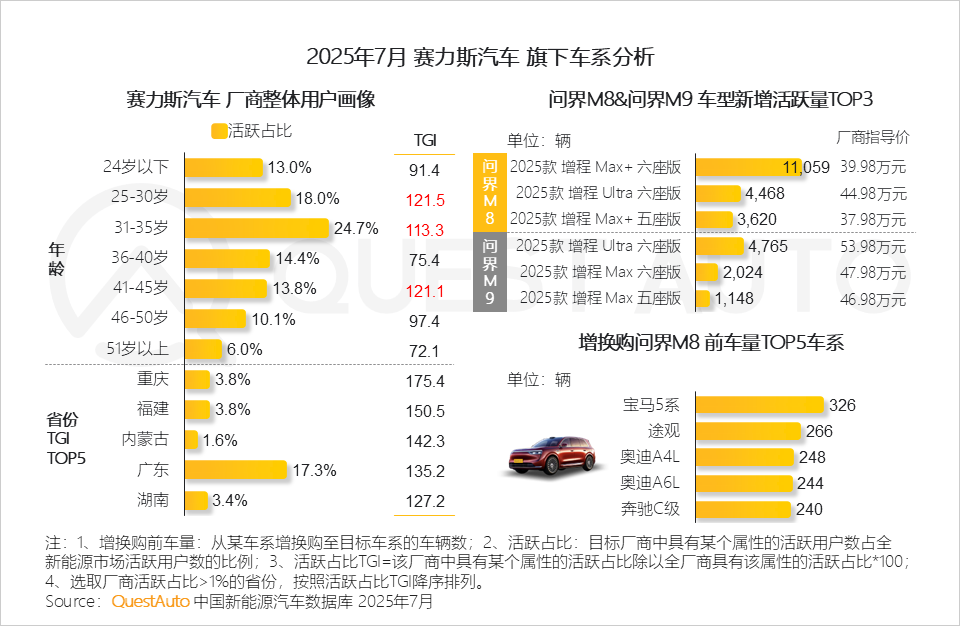 6、赛力斯在总部所在地重庆及福建、广东等地畅销,问界M9高端车型凭借顶级配置与豪华体验赢得市场认可,问界M8吸引“BBA”品牌车主增换购