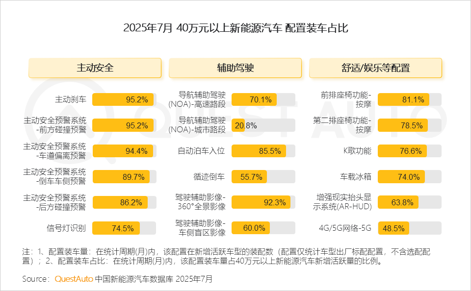 5、在豪华汽车市场,基础安全配置已趋于完善,高速NOA广泛普及,城市NOA成下一个竞争核心,自动泊车、全景影像成为标配;车载冰箱、按摩座椅、大屏娱乐配置定义舒适豪华体验