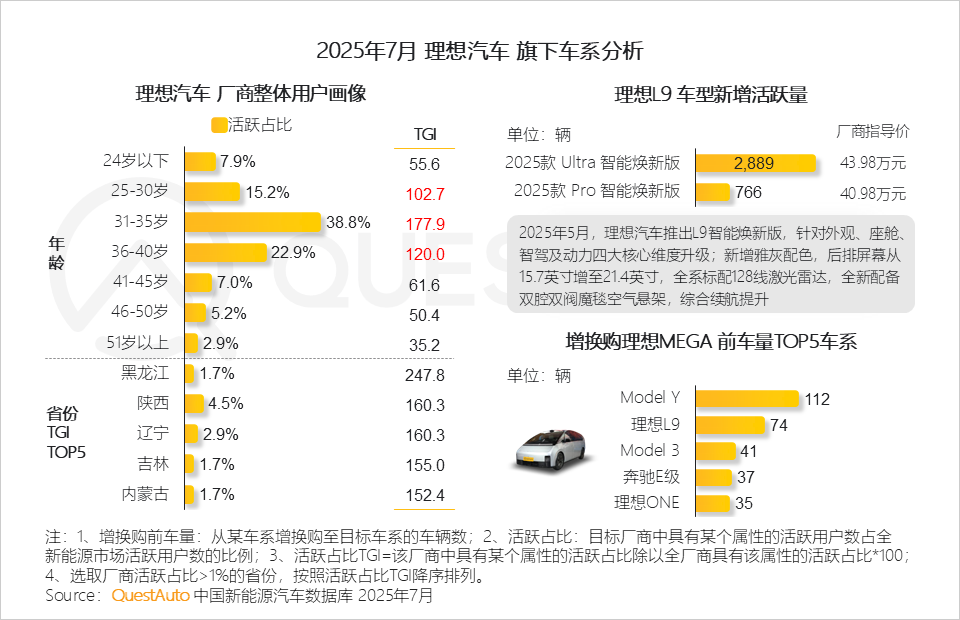 7、理想汽车核心用户为31-40岁家庭人群,在东北市场表现强劲,理想L9升级重点围绕智能与性能,强化科技家庭用车标签;理想MEGA增换购用户主要来源于品牌内部及特斯拉用户