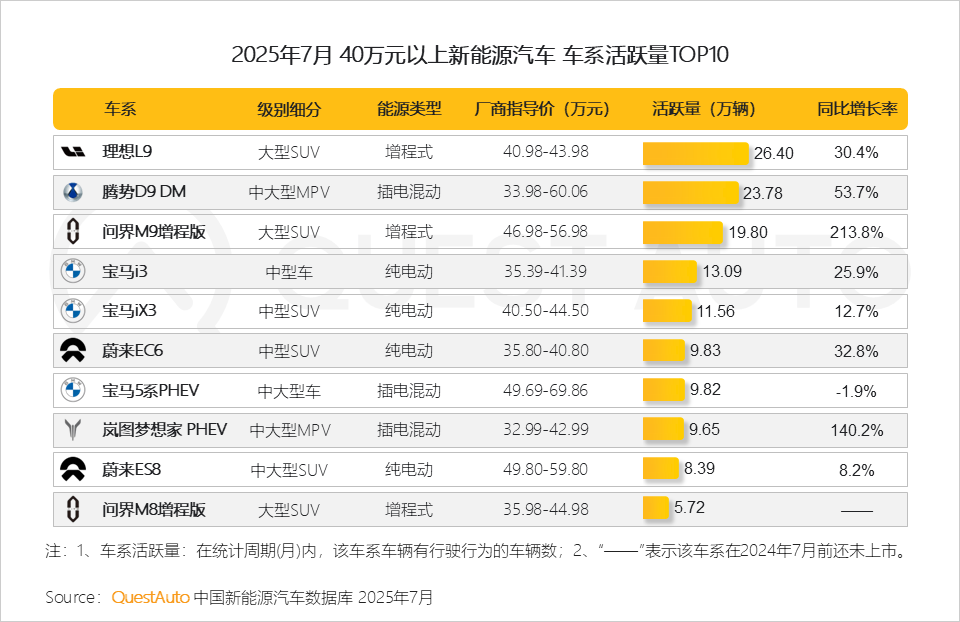 3、从活跃量来看,在40万元以上的市场中,理想L9、腾势D9 DM-i和问界M9增程版位列前三;宝马在纯电动转型方面表现亮眼,而4月新上市的问界M8已迅速跻身榜单前十