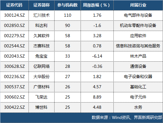 根据界面新闻统计,本周机构们调研的上司公司分布于54个细分行业。其中,基础化工、工业机械、电气部件与设备行业获调研的上司公司数量最多,分别为11家、8家、7家。在基础化工领域,广信材料(300537.SZ)、传化智联(002010.SZ)、星源材质(300568.SZ)成为最受机构关注的上市公司;而工业机械领域,机构们的目光主要投向劲拓股份(300400.SZ)、烟台冰轮(000811.SZ)、威星智能(002849.SZ);电气部件与设备领域,则以汇川技术(300124.SZ)、蓝海华腾(300484.SZ)、科陆电子(002121.SZ)获调研的机构数量最多。