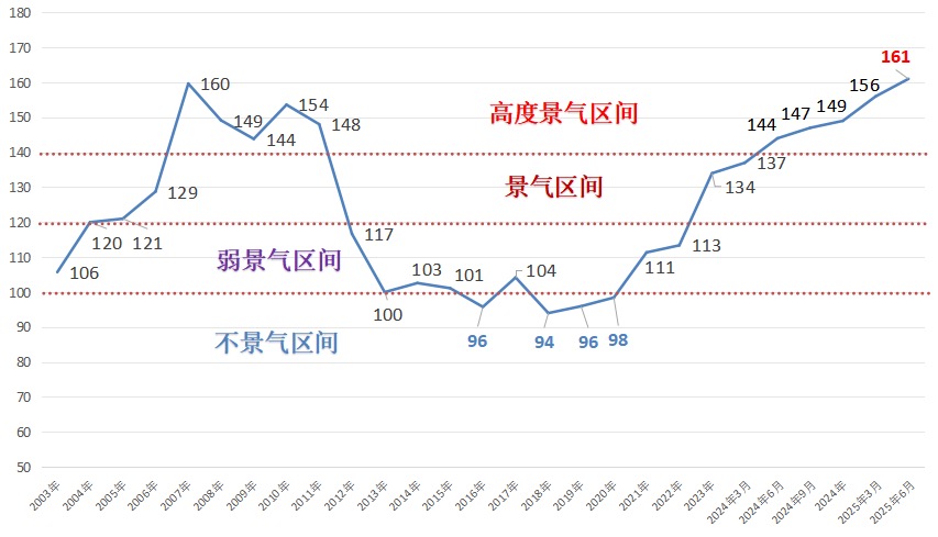 自2024年中国造船行业景气指数再次突破140点、进入“高度景气区间”以来,中国造船行业景气指数不断攀升。