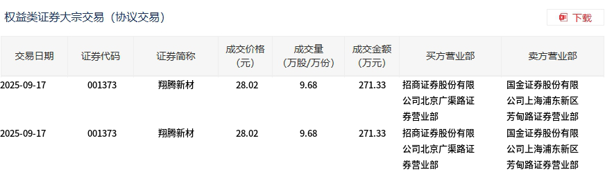 9月17日,翔腾新材大宗交易成交19.36万股,成交额542.66万元,占当日总成交额的13.06%,成交价28.02元,较市场收盘价31.54元折价11.16%。