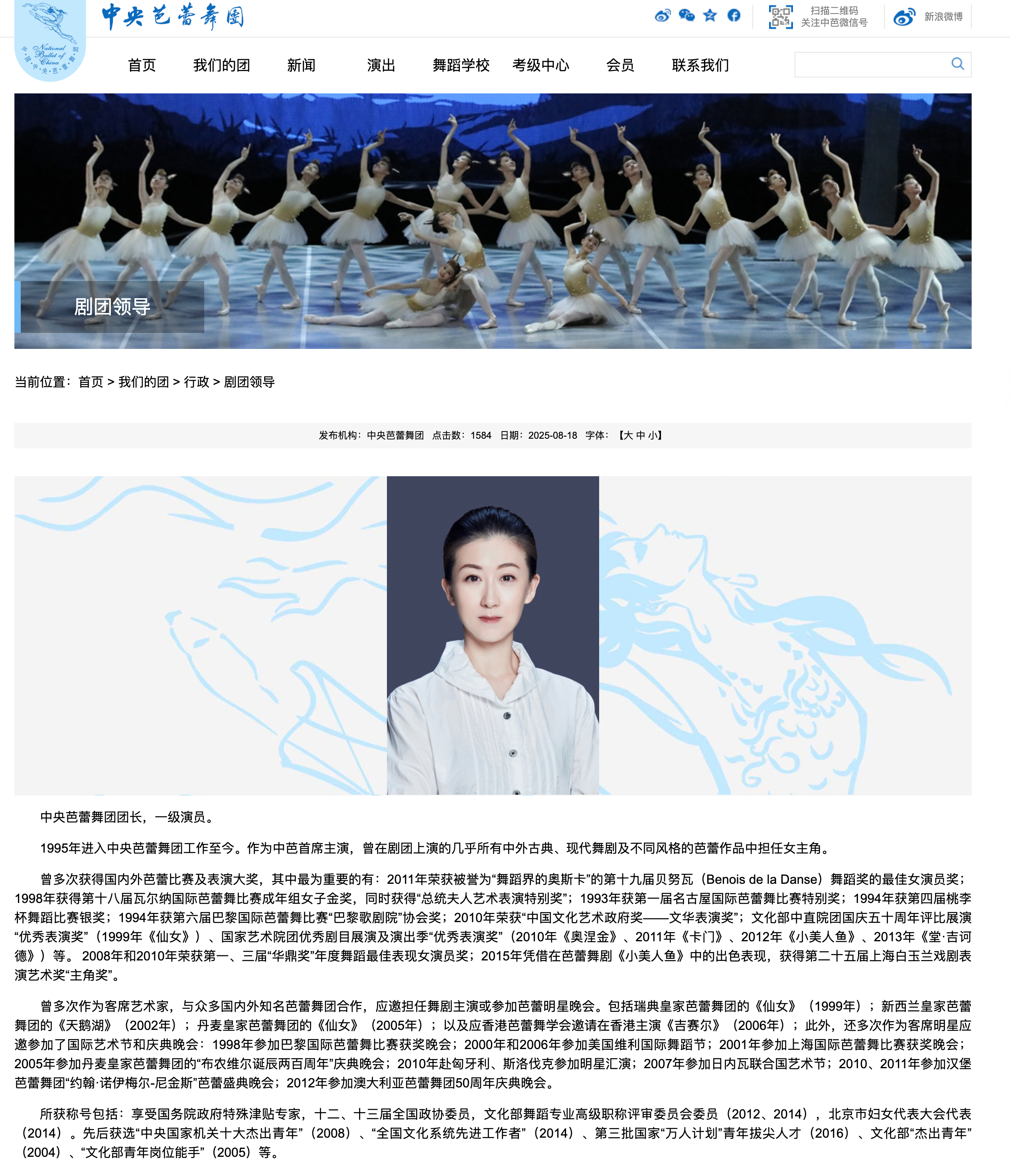 中央芭蕾舞团网站更新显示,国家一级演员朱妍已担任中央芭蕾舞团团长。
