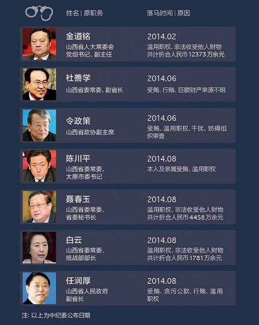 2014年开始,山西进行了长达2年的大规模官员调整,7名副部级以上官员落马,4名副部级以上官员调离山西,9名副部级以上高官“空降”……