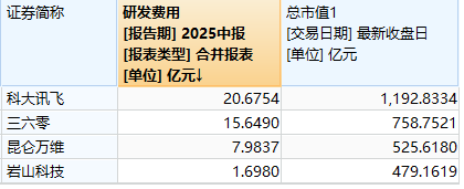 2025 年上半年,岩山科技研发费用为 1.7 亿元,看似绝对值不低,但放在 “自研大模型” 赛道中,却显得微不足道。同期 A 股另外三家声称自研大模型的公司,研发投入均远超岩山科技。其中科大讯飞同期研发投入20.7 亿元,是岩山科技的 12 倍;三六零研发投入15.6 亿元,是岩山科技的 9 倍;昆仑万维研发8 亿元,是岩山科技的 4.7 倍。