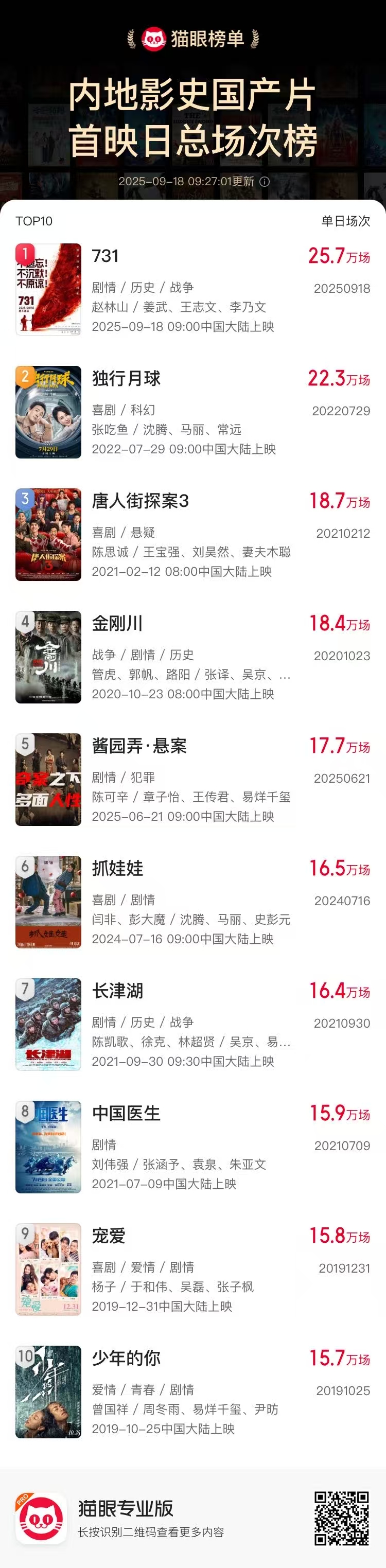 9月18日,电影《731》正式上映。根据猫眼专业平台数据,截至9时30分,今日票房已超1.36亿元,成为中国内地影史单片单日总场次冠军、中国内地影史首映日总场次冠军。