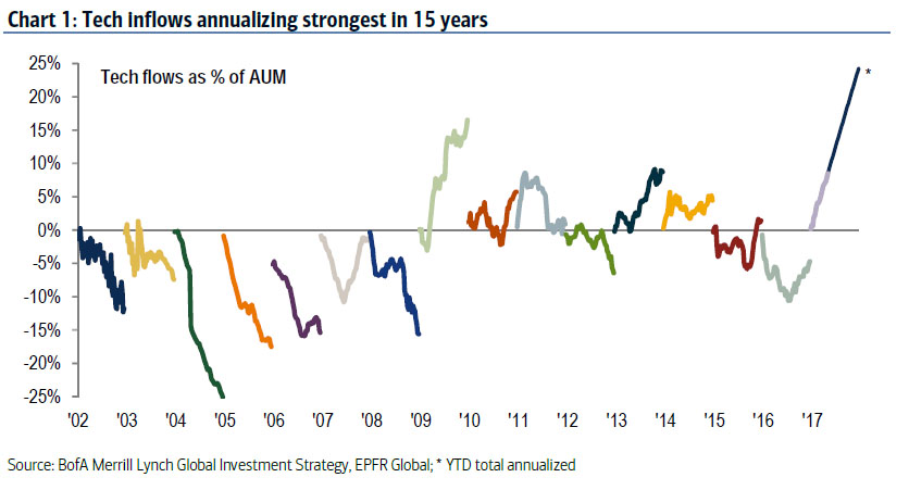 2017年以来,美股科技股持续走强。纳斯达克指数的涨幅远超标普500指数,数家科技龙头公司推动指数上涨,苹果、FACEBOOK、亚马逊、微软、Alphabet(谷歌母公司)均大幅上涨。但美银美林分析师Mike Hartnett认为,美股出现的科技热可能会面临更大风险。