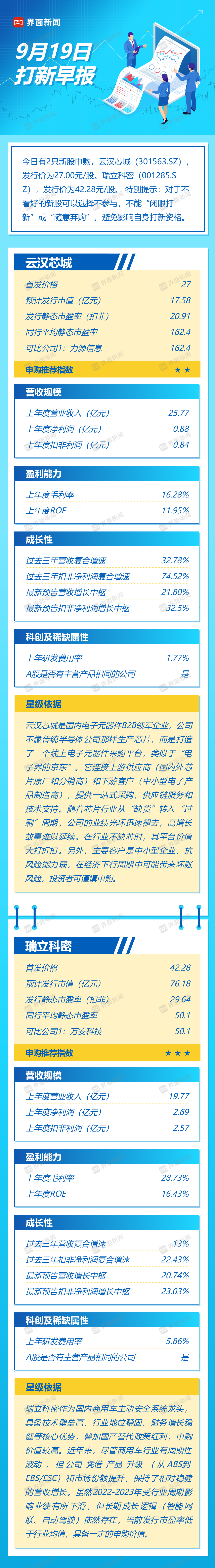 今日有2只新股申购,云汉芯城(301563.SZ),发行价为27.00元/股。瑞立科密(001285.SZ),发行价为42.28元/股。