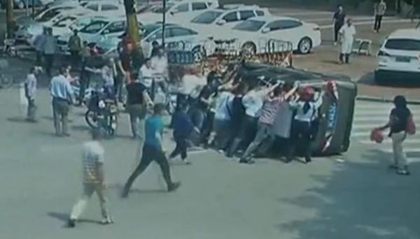 【广东】惠州一起车辆侧翻事故后 20多名路人抬车救人