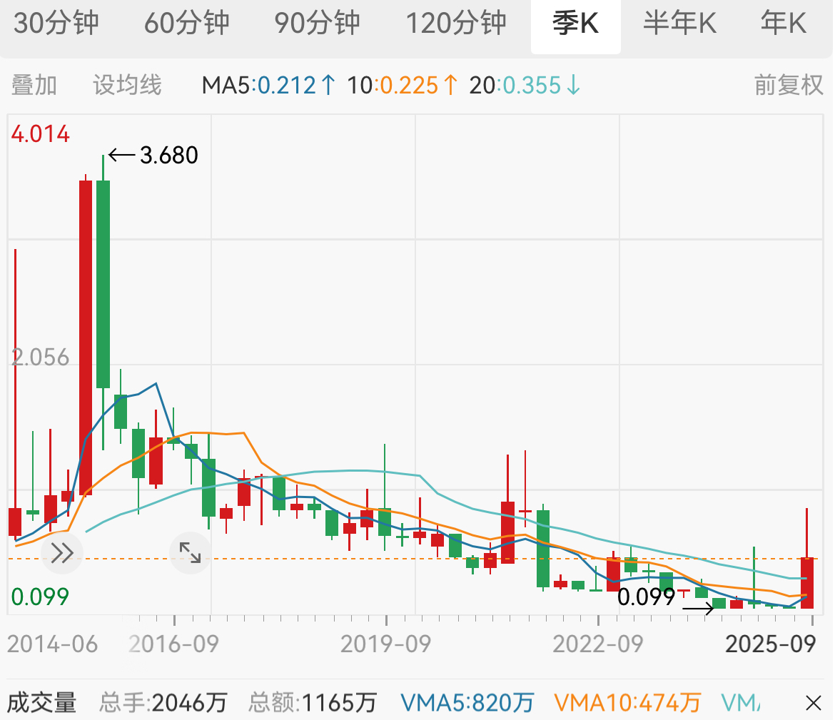而纵观过往,该公司股价在2015年7月到达历史高点3.68港元/股后,数年里股价一直处于波动下跌趋势。据界面新闻观察,2025年以来,该公司股价长期位于0.2港元/股以下,所以此次暴涨也引发了市场的广泛关注。