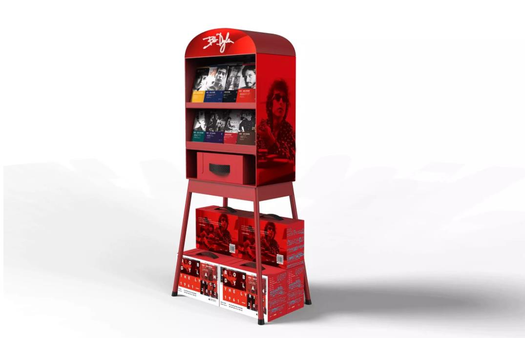 虽然是书,但这套《鲍勃·迪伦诗歌集(1961—2012)》从里到外却是一副快消品的卖相,包装设计颇似英国薯片Tyrrells的黑白照片包装,还用了口袋本的设计。此外还有口琴、旅行箱造型的书盒以及“时光贩诗机”——一个复古风格的书籍展示架。