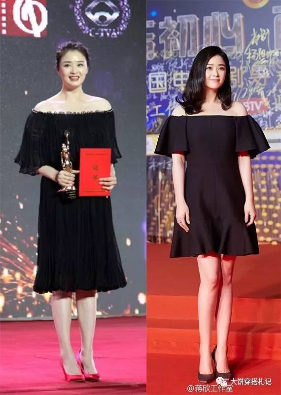 但总的说来,荷叶边不够垂坠、褶皱太多、硬质感的撑了起来……都会增加横向视觉!所以想要穿露肩装,娘娘这类身型的姑娘选择斜肩、V型设计的露肩装,效果就能好了不少~
