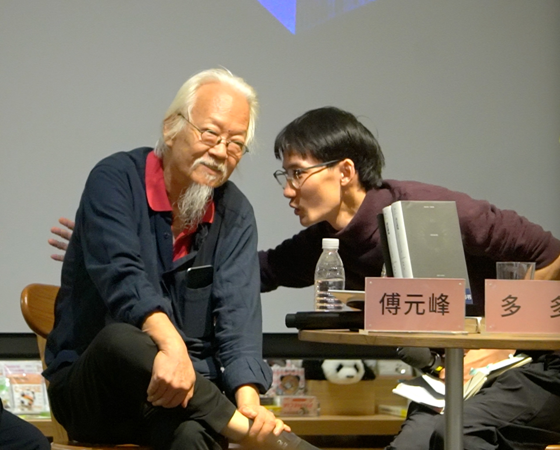 听罢多多的“宣言”,主持人连忙接回话筒,有点不知所措。接下来整整52分钟的发言过程中,准备好的问题被频繁抛给台上唯二“能讲话”的南京大学文学院教授傅元峰和本书的责编拓野。多多在一旁则是不时挠挠脸,亦或用手指缠绕自己花白的胡子,探身拿起装着茶叶的水杯,偶尔听到观点时颔首,但他始终一言不发。