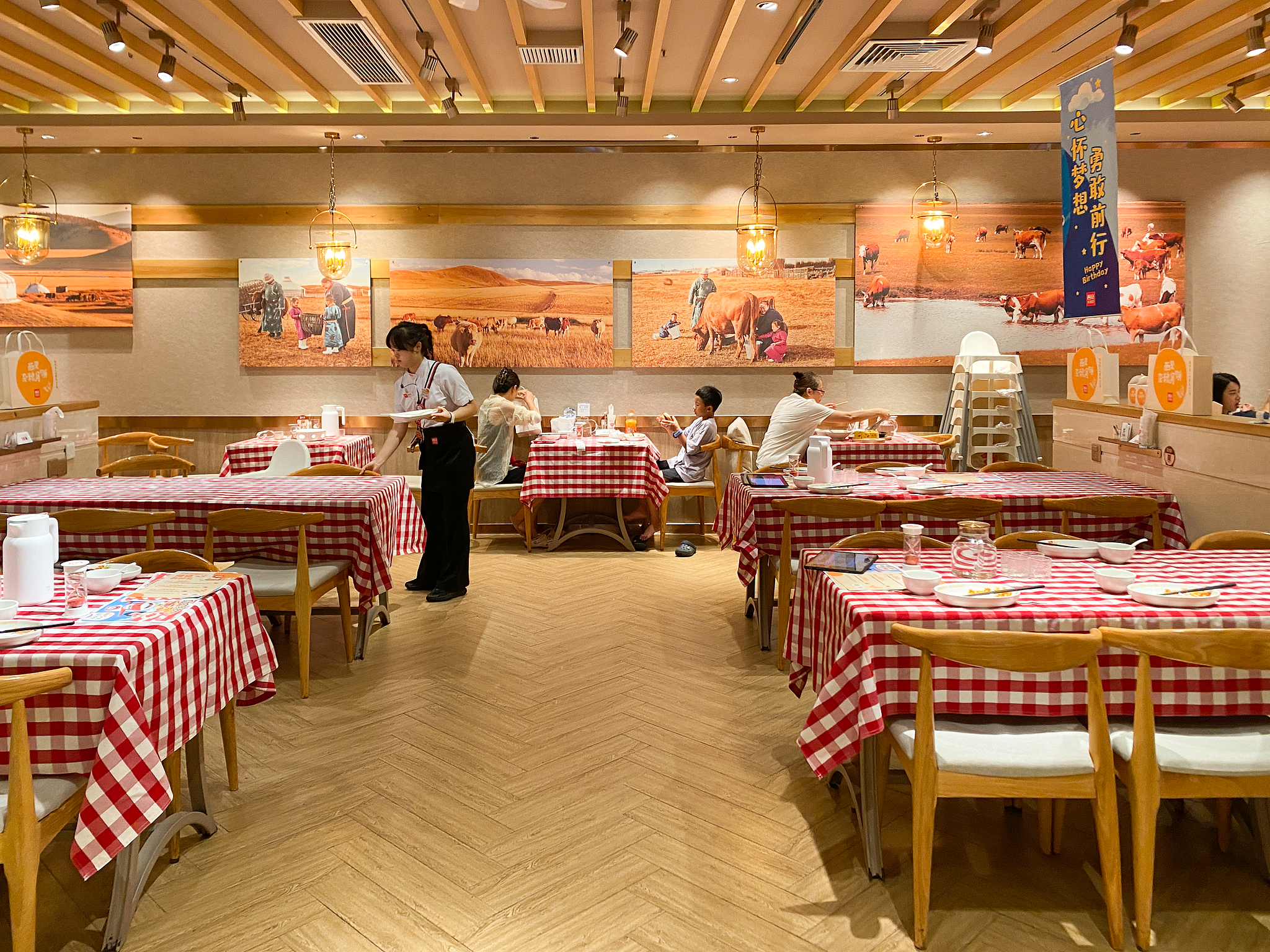 西贝的发展过程就很有意思。大致分三代:第一代是街边大酒楼,几千平米、两百道菜,符合大家对中餐酒楼的印象。2010 年之后,第二代进入大型商场,店面缩小到七八百平,菜品减少到一百道。2014 年开始第三代,进入核心商圈,店面缩到六百平,菜品再减到五十道,位置更小、更贵,也更符合“高级快餐”的感觉。