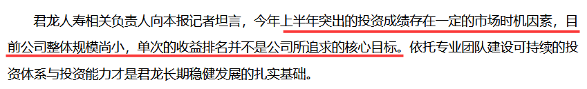 好在,看上去君龙人寿也很清楚国家的相关规定,和公司目前所处的状态。其相关负责人对媒体表示,上半年突出的投资成绩存在市场时机因素,单次的收益排名不是公司追求的核心目标。