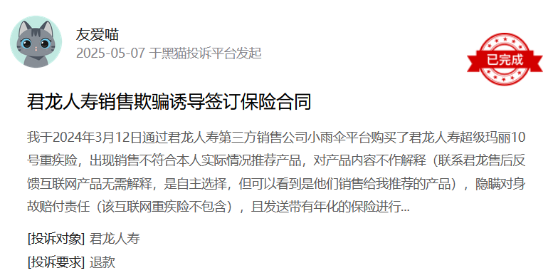 官网显示,君龙人寿在售保险产品中,医疗险、重疾险、意外险数量较多,“小青龙”系列少儿重疾险、“超级玛丽”成人重疾险是其“网红”产品,在保障范围和赔付次数上有一定优势。不过,在网络投诉平台上,有消费者反馈购买“超级玛丽”产品时,销售人员存在欺骗隐瞒行为。