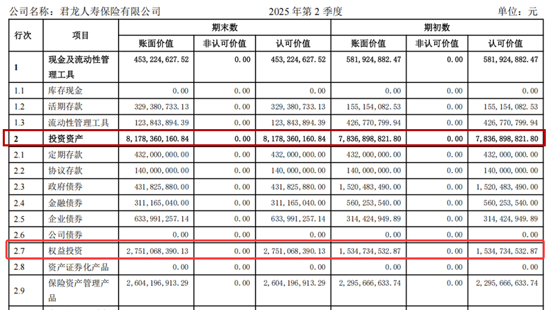 除了市场原因,君龙人寿名次大幅上升,与投资仓位飙升有关。截至2025年上半年末,君龙人寿权益投资余额约28亿元,较去年末增长79%,占投资资产总额的33%,较去年末上升14个百分点。
