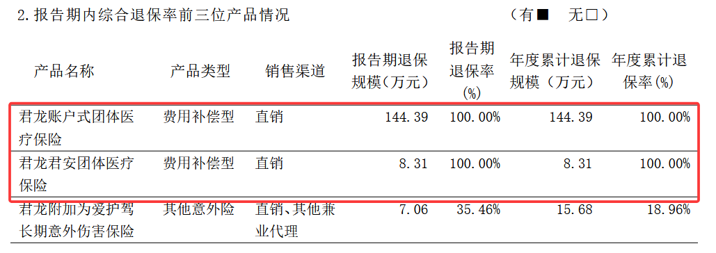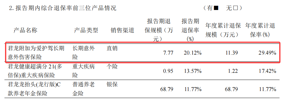 产品方面,君龙人寿产品存在产品退保率较高的情况。根据偿付能力报告显示,君龙人寿2024年有部分产品本来销售额就不大,但综合退保率却达到了100%。2025年上半年,也有产品综合退保率接近30%。