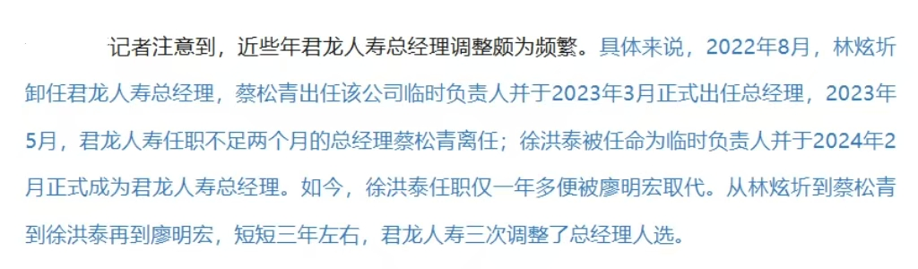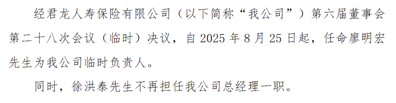 君龙人寿9月5日发布公告,自8月25日起,任命廖明宏为公司临时负责人。同时,徐洪泰不再担任公司总经理职务。
