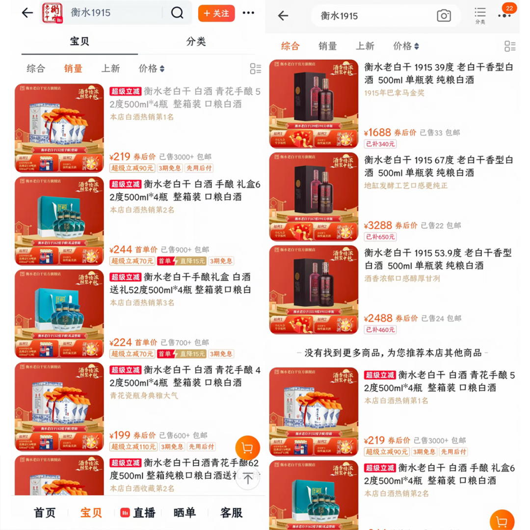 酒讯通过搜索衡水老白干天猫官方旗舰店发现,其销量排名前五的产品均为单价百元以下的中低端产品,而高端产品1915系列中的39度、53.9度、67度版本,月销量均在30单左右,销量约为“销冠”产品的1%。