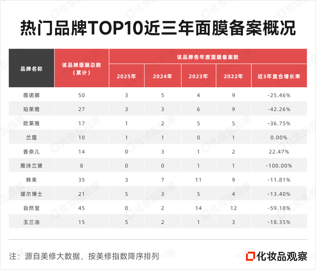 热门品牌TOP10(按美修指数降序排列)中,近三年面膜备案数复合增长率为负数的品牌占比达八成;面膜数累计最多的是薇诺娜,近三年复合增长率为-25.46%;跌幅最大的是雅诗兰黛,自去年开始,便未再推出任何面膜新品;而今年以来,除了雅诗兰黛,香奈儿、自然堂面膜备案数亦为0。