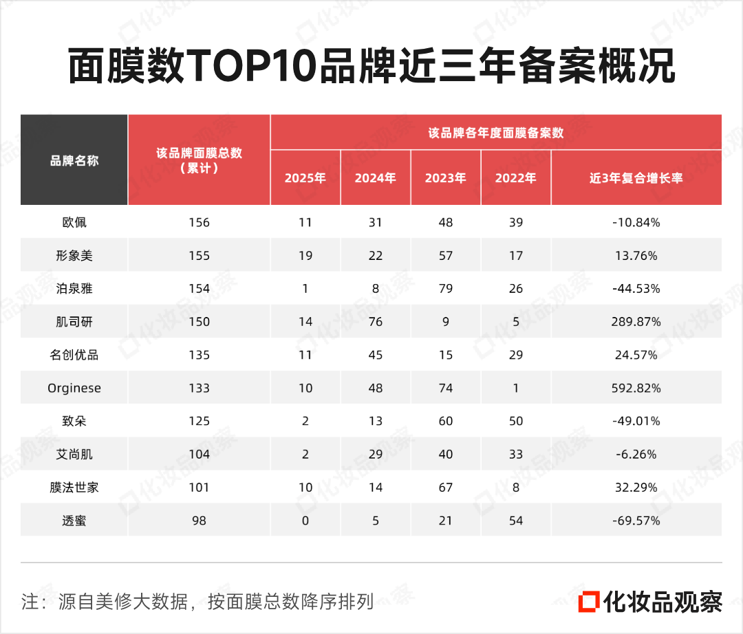 再看面膜数TOP10品牌,几乎都拥有上百款面膜产品,虽然下滑态势没有热门品牌TOP10那么“惨烈”,但近三年面膜备案数复合增长率为负数的品牌也占据了半壁江山,其中泊泉雅、透蜜在去年直接从双位数跌至个位数,后者今年以来更是陷入沉寂。