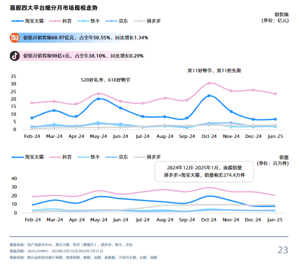 另一个佐证是,从近12个月(2024年2月1日-2025年1月31日)的数据来看,抖音面膜市场已经全面超越淘宝天猫,在2024年12月至2025年1月期间,拼多多面膜销量也出现超越淘宝天猫的迹象,可见极致性价比面膜正在抢占市场。