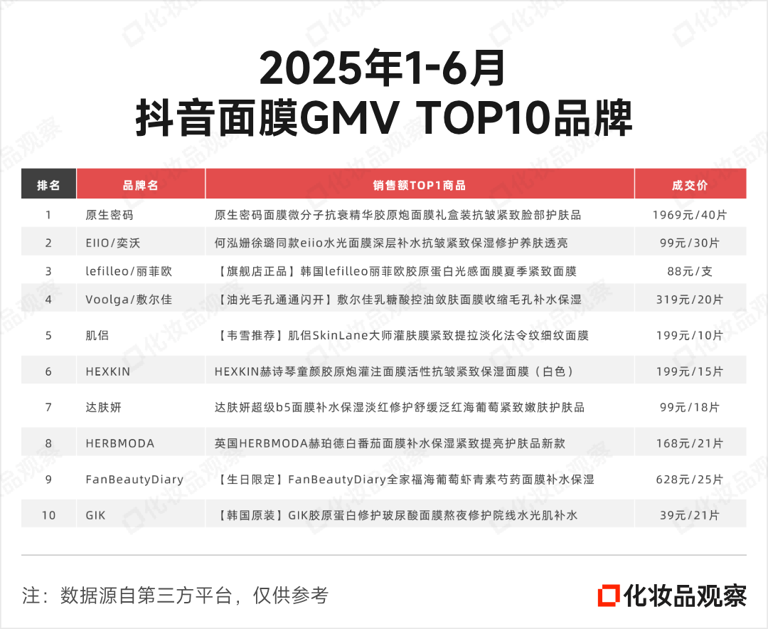 以2025年1-6月抖音面膜GMV TOP10品牌榜为例,过半品牌的明星面膜单片价格跌至个位数,如GIK的明星面膜单品低至1.8元每片。而TOP1原生密码虽然单片价格高至49元,但其价格高并却不意味着品质高,对行业的价值也有待商榷(详情见《客单价1800+元的面膜,在抖音卖了超10亿》)。