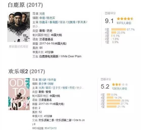 紧接《白鹿原》之后播出的《欢乐颂2》,却遭遇了口碑的滑铁卢。相较于第一季,这一季可以说是槽点满满。拖沓的剧情,无处不在的广告,个别演员浮夸的演技,都招致了观众的吐槽。在豆瓣上,《欢乐颂2》的评分仅有5.2分,远低于第一季的7.5分。