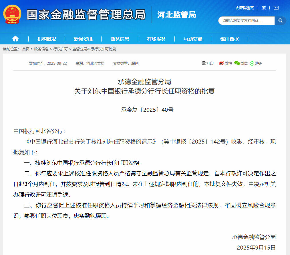 据国家金融监督管理总局河北监管局的批复文件显示,承德金融监管分局核准刘东中国银行承德分行行长的任职资格。
