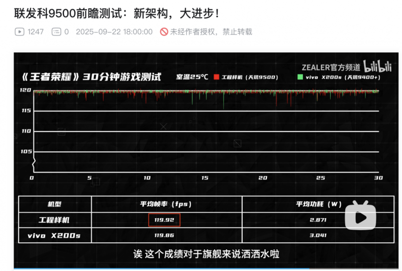 ZEALER媒体测试, 首先在室温下运行王者荣耀半个小时,天玑9500跑出了平均119.5帧的成绩,毕竟只是王者嘛,这个成绩对于旗舰来说洒洒水啦,但在功耗方面,天玑9500直接把整机功耗干进了3瓦大关,只有2.8瓦了。看样子发哥这次在中低性能的功耗表现确实非常亮眼。