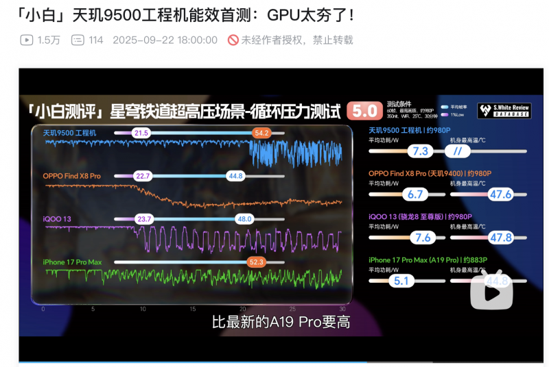 小白测评实测后给出的结论显示,在超高压场景,数据5.0星铁黄金的时刻,上代旗舰处理器基本都在10分钟就出现了降帧,9500工程机是在20分钟之后,抗压能力提升明显。当然工程机在帧率上的策略,并非一上来就稳得很高。平均帧率54.2FPS,比最新的A19 Pro高,而且9500工程机的画质是高于iPhone的。功耗7.3W,结合帧率表现来看,这功耗确实很亮眼。