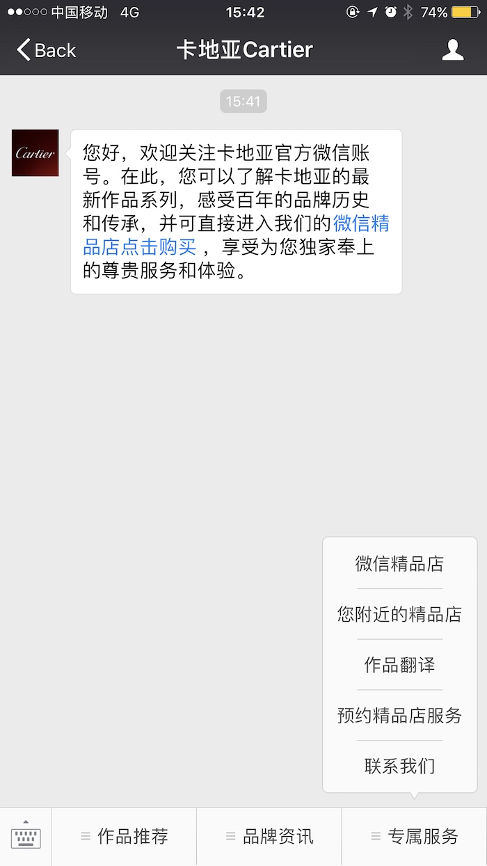 不过,进阶版的功能一般多在大众消费品牌功能出现。因为奢侈品牌的VIP只是极少数购买力极强的顾客。这些品牌本身不存在“会员”这个概念,也没有所谓的会员礼品,又或是积分制等可以刺激顾客购买欲望和忠诚度的激励元素。但配合微信点到点、个人化的传播路径,奢侈品牌能够转而给到更私人化的服务。Cartier公号中的“专属服务”就是例子。