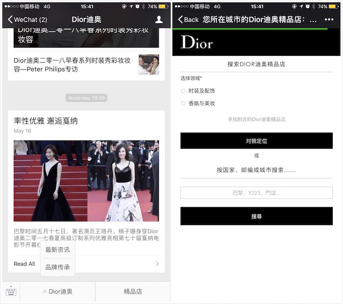 现在,如果你点开几个奢侈品牌的微信公号后,便会发现页面下方通常都会有两到三个可选栏目。比如,Dior的公号有介绍品牌故事和最新资讯的子选项,以及通过用户手机定位功能提供最近门店推荐服务的“精品店”。