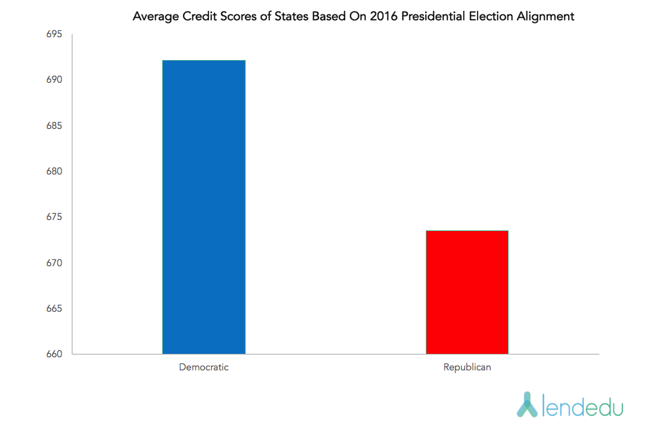 相反,如果所有这些经济指标都向好,那么这个州的平均信用评分就会上升。研究得出蓝州的平均分是692,红州的平均分是673。