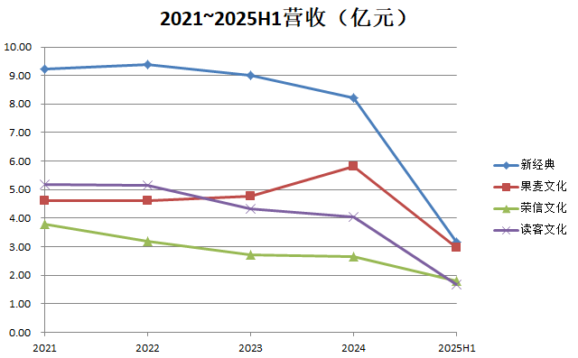 从行业对比看,读客文化的市场地位下滑更为明显。目前,A股民营大众出版公司除了读客文化还有果麦文化(301052.SZ)、荣信文化(301231.SZ)和新经典(603096.SH)。2021年读客文化上市之初,公营收规模为5.19亿元,位列这四家公司中的第二名;到2025年上半年,读客文化的营收规模为1.68亿元,在这四家公司中垫底。